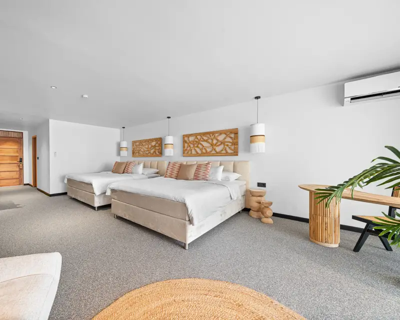 The suite features a private balcony and is furnished with two generous king-size beds, perfect for a restful night’s sleep. The room also offers modern amenities such as air conditioning, a flat-screen TV, and a safe for your valuables. Start your day with a fresh cup of coffee or tea, easily prepared using the in-room kettle.