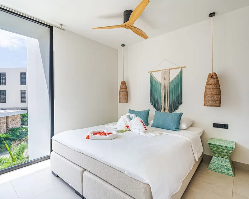 At the brand-new Plaza Royal Residence, you’ll find the new one-bedroom apartments of Van der Valk Plaza Resort Bonaire. These exclusive apartments are equipped with all the modern conveniences, allowing you to fully enjoy a relaxing vacation by the Caribbean Sea. The one-bedroom apartment at Van der Valk Plaza Resort Bonaire features one separate bedroom, a cozy living room with an open kitchen, and an option for a sofa bed. The bedroom is furnished with a king-size bed, and the bathroom is equipped with a luxurious walk-in shower, a toilet, and a hairdryer. To keep cool in Bonaire's tropical temperatures, the apartment is also fitted with air conditioning. Additionally, the one-bedroom apartment includes a free safe, a television, complimentary Wi-Fi, and a fully equipped kitchenette (with a stove, oven, coffee and tea facilities, a refrigerator, and a dishwasher). The balcony or terrace is the ideal place to unwind and enjoy the beautiful views of the gardens at Van der Valk Plaza Resort Bonaire.